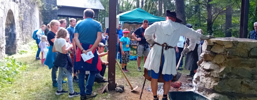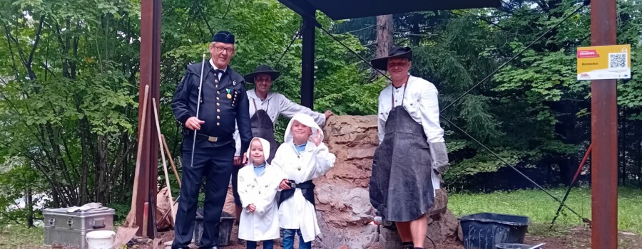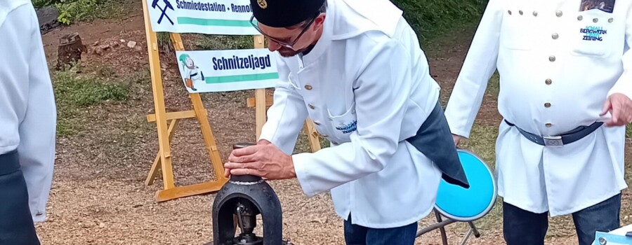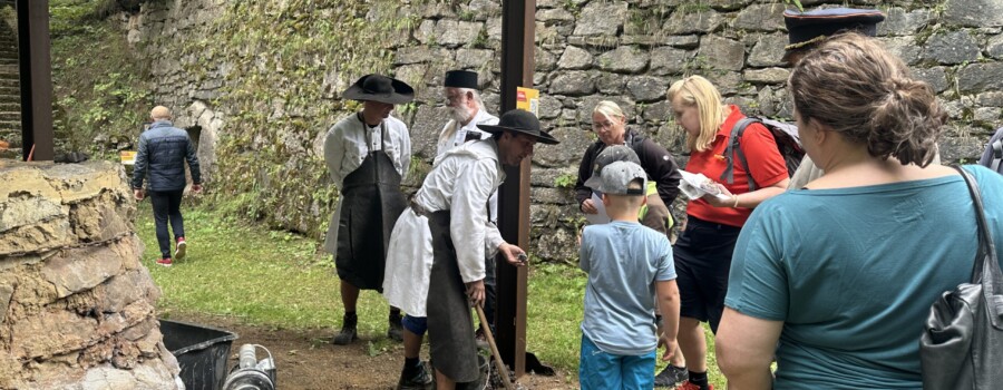 Weiter ging es in Richtung Oswaldirücken, wo abwechslungsreiche Spielestationen, unter anderem auch die „Erzberg-Hüfburg“ zum Mitmachen einluden. Ob Geschwindigkeit, Geschick oder kniffliger Denksport – für jedes Alter war etwas dabei. Ein Highlight war die abenteuerliche Schnitzeljagd „Der Schatz am Eisenberg“, die die Gäste durch den Stollen bis zum Rennofen führte, wo die Knappschaft Eisenerz, wie schon in den letzten Jahren, den traditionellen Abstich durchführte und Wissenswertes zum Bergbau von früher und heute erzählen konnte.