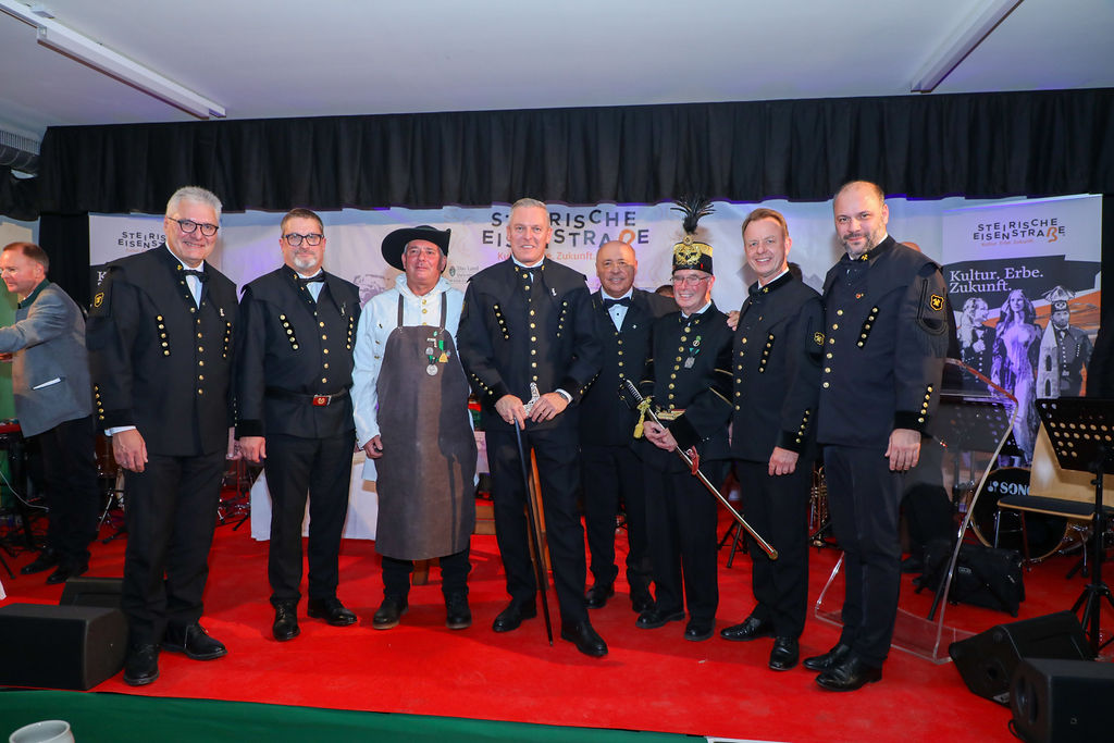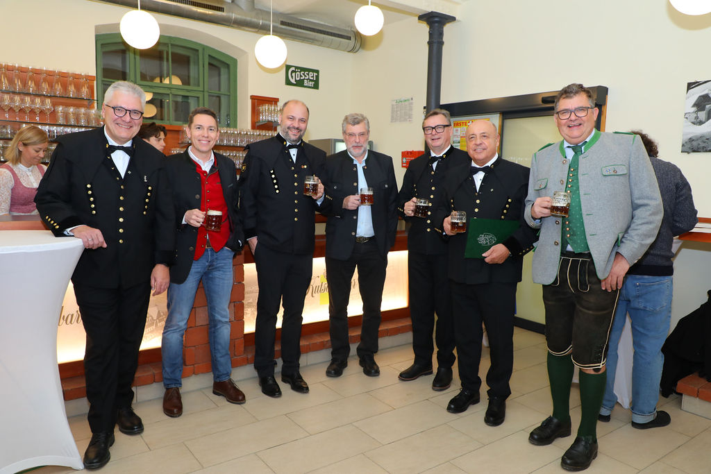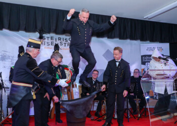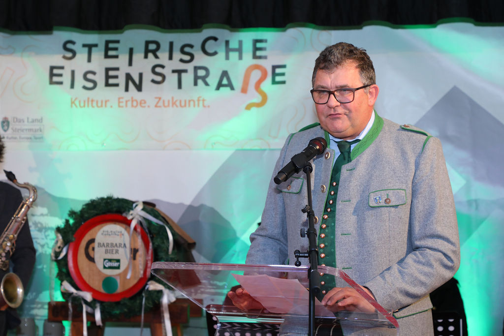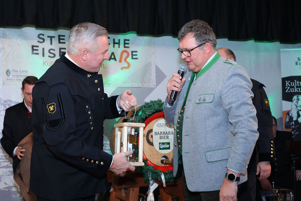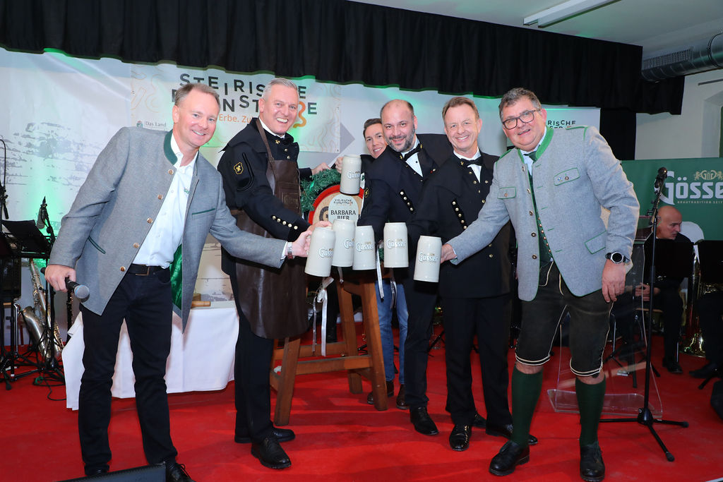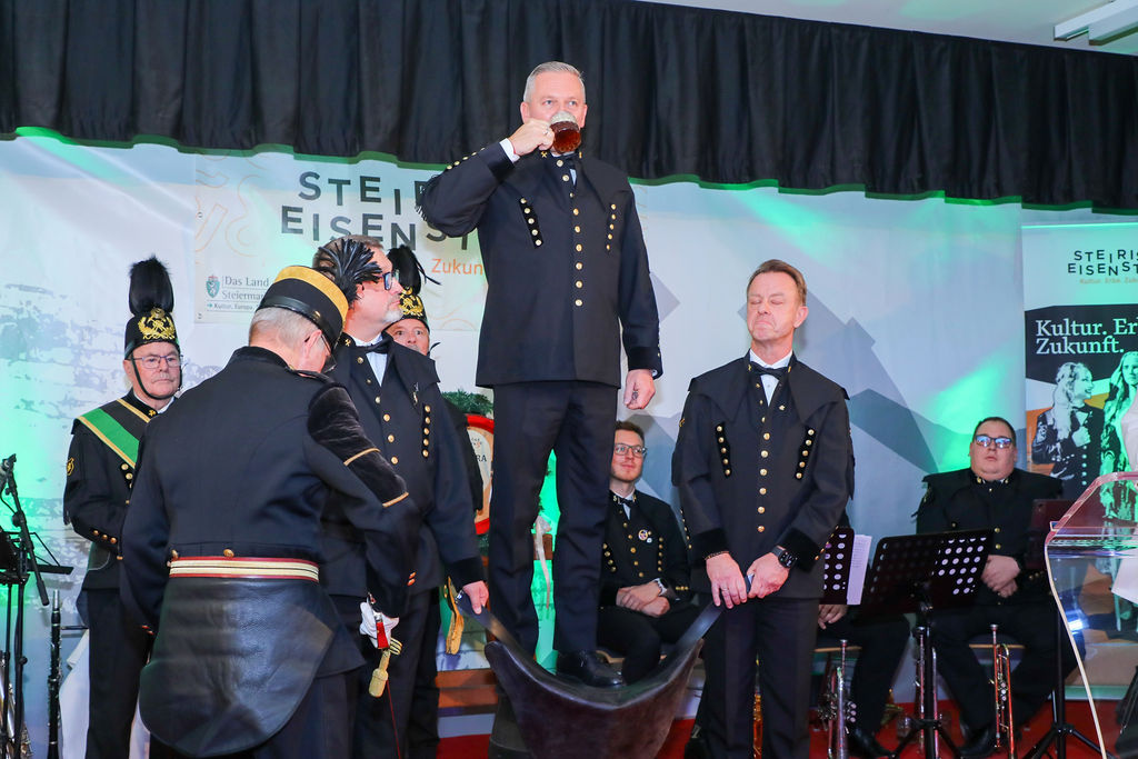 Erstmals beging der Verein Steirische Eisenstraße den Barbaratag am 4. Dezember 2025 im Liesingtal – im historischen Fohlenhof in Kalwang. Höhepunkt des Abends war die Aufnahme von Landeshauptmann Mario Kunasek in den Ehrenbergmannsstand. Tra-ditionell wurde bei dieser Gelegenheit auch das Barbara-Bier 2025 feierlich angezapft. Zahlreiche Ehrengäste folgten der Einladung des Vereins, darunter Nationalrat Franz Jantschner, Lan-desrat Hannes Amesbauer, die Klubobleute Marco Triller und Johannes Schwarz, LAbg. Cornelia Izzo, der ehemalige Lhptm.-Stv. Anton Lang, Bezirkshauptmann Markus Kraxner, ORF-Steiermark-Chef & Eisenstraßenbotschafter Gerhard Koch sowie der Rektor der Montanuniversität Leoben, Peter Mo-ser. Neben Hausherrn Mario Angerer waren zahlreiche weitere Bürgermeister der Region anwesend. Mit Eisenstraßenobmann Mario Abl, Mario Kunasek, Mario Angerer und Moderator Mario Fraiss standen diesmal gleich Marios im Mittelpunkt des Geschehens. Mario Abl dankte in seiner Anspra-che insbesondere den Knappschaften, die das Rückgrat der als immaterielles UNESCO-Erbe aner-kannten bergmännischen Traditionen sind. Ebenso würdigte er die Brauerei Göss für das eigens ge-braute Barbara-Bier. Abl unterstrich den hohen Stellenwert von Zusammenhalt und regionaler Ko-operation, gerade in herausfordernden Zeiten. Die Steirische Eisenstraße sei ein wichtiges Netzwerk und eine starke Allianz für die Region, die vieles möglich mache – dies zeige etwa auch die aktuelle Bewerbung der Österreichischen Eisenstraße um Anerkennung als UNESCO-Welterbe, die im Sep-tember in Paris eingereicht wurde. Um 19:50 Uhr war es schließlich so weit: Nach einer Laudatio von voestalpine-Betriebsratsvorsitzen-dem Josef Gritz vollzog Landeshauptmann Mario Kunasek den symbolischen Sprung „über das Le-der“ vom Bierfass in den Ehrenbergmannsstand – sichtlich bewegt und begleitet von seinem Wahl-spruch: „Stolz, mutig, stark – für unsere Heimat, die Steiermark.“ In seiner Dankesrede betonte er, sich weiterhin für die lebendige Tradition der Eisenstraße und die Region einsetzen zu wollen. Nach dem offiziellen Anstich durch Braumeister Michael Zotter herrschte Einigkeit: Auch heuer sei es „das beste Barbarabier aller Zeiten“. Den festlichen Ausklang bildeten das traditionelle Barbaragu-lasch sowie die Verkostung des frisch gebrauten Bieres, das ausschließlich in den Gaststätten der Re-gion erhältlich sein wird. Für musikalische Akzente sorgten Steira 7 und die Jazz Bandits. Ergänzt wurde das Programm durch Darbietungen der Knappschaften Leoben-Seegraben und Radmer.